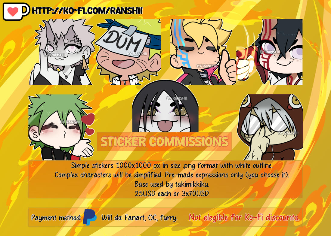 The Reward Program or Customer Loyalty Program is intended to reward frequent customers for their support.Through this program the customer can earn free art simply by purchasing art of any value and earning stickers that can be redeemed for rewards once the required sticker amount has been accumulated.How to qualify?There's two ways:1- Be a Ko-Fi subscriber from tier "You Go!" and above and purchase any commission from me.2- Purchase at least two commissions of any value and type from me and accept to enroll in the program.How does it work?Once you enter the program you will receive a blank sticker sheet as shown above.Each time you purchase a commission you will earn a sticker that will be added to your sheet.The sheet contains two rows with one reward each. Once you complete a row you can claim the prize for that row.The card resets once filled and after all prizes have been redemed and you can complete it all over again.There is no minimum amount to spend, you can purchase any commission of any value to earn a sticker once you have entered the program, likewise there's no minimum amount to spend to enter, the only purchase requeriment is to acquire at least 2 commissions of any value and type.Important:Each prize is limited to one single character only.You can't accumulate more than two unclaimed prizes at the same time (or one full reward card).If you don't redeem your prizes you won't be able to accumulate any more stickers until you do.Lost stickers will not be retroactively added to your card even after prizes have been redeemed, so please don't forget to claim them to keep earning stickers!Prizes have lower priority than commissions and will be worked on at a slower rate depending on my queue.